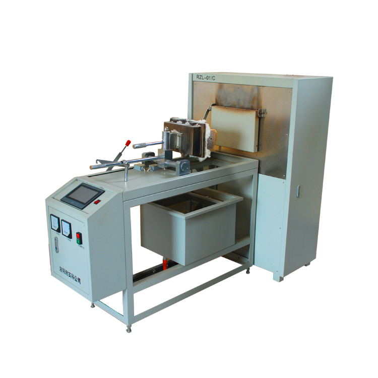 抗热震试验机是耐火制品检测项目中的主要技术指标之一,本设备为水冷式试验机,即把要试验的耐火制品送入高温炉箱内,当温度升至1100度的时候拉出来,并迅速投入下面的冷水槽内,待完全冷却之后再送入高温炉箱内,这样反复循环,直到测试的耐火制品出现掉块时才终止测试。这样反复水冷的次数为抗热震次数,循环测试的次数越多说明耐火制品的抗热震的性能越好。